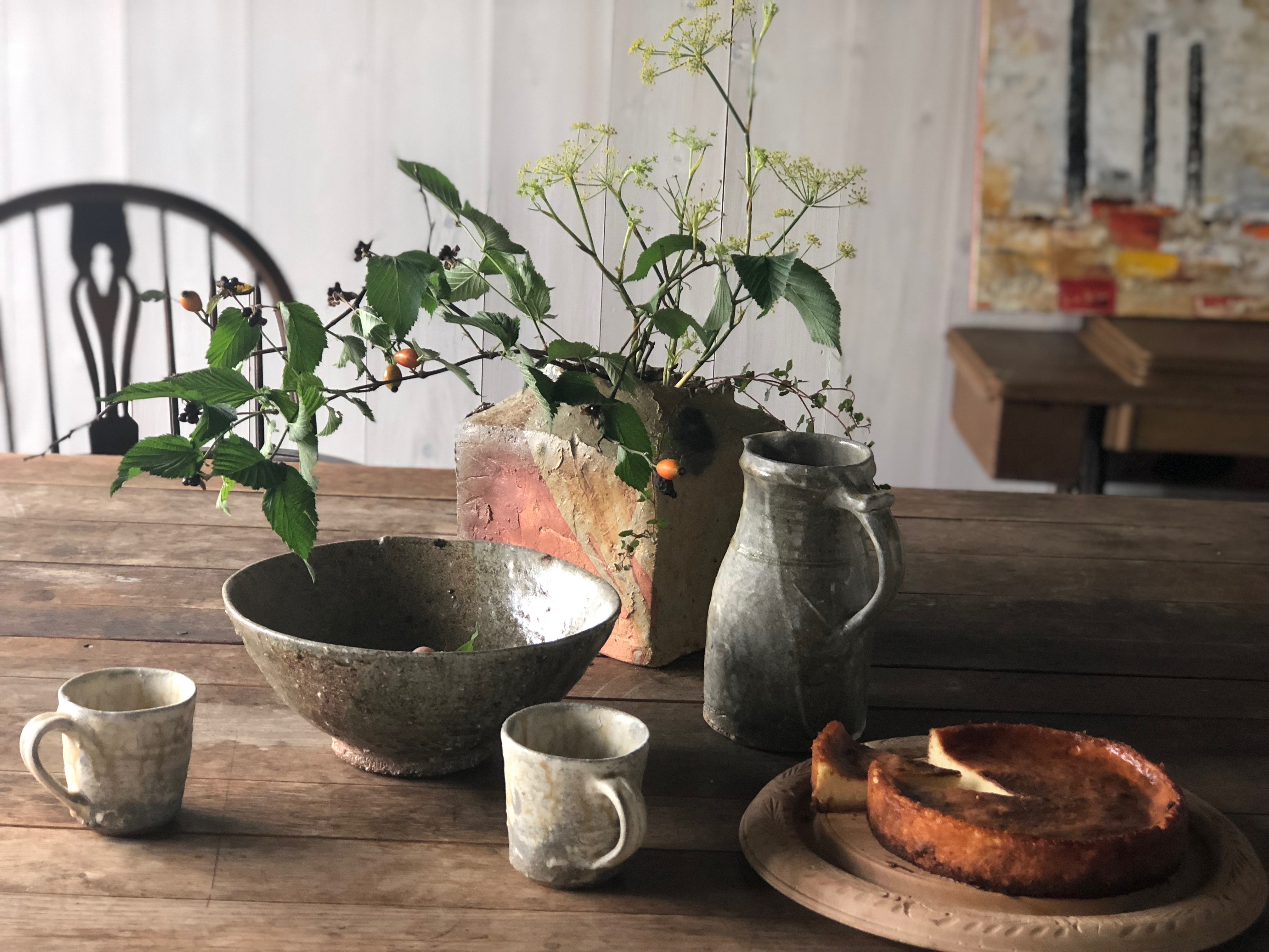 小ぶりのミルクピッチャーから、大きめのピッチャー、益子の土をベースに、掛け分け、飴釉、塩釉、伊羅保など。